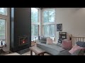 - Salon chaleureux doté d'un foyer au bois STUV à combustion lente.