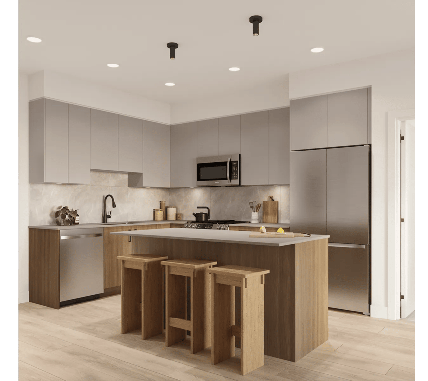 Frêne - Une interprétation moderne de tons intemporels. Fusionnant harmonieusement les tons froids et chauds, ce meuble présente des armoires supérieures en gris cendré et des armoires inférieures en noyer.